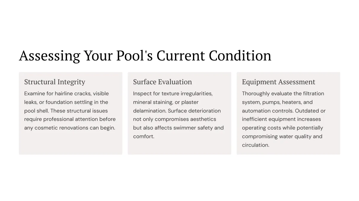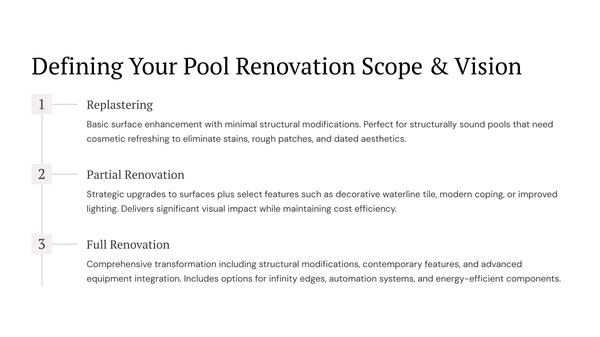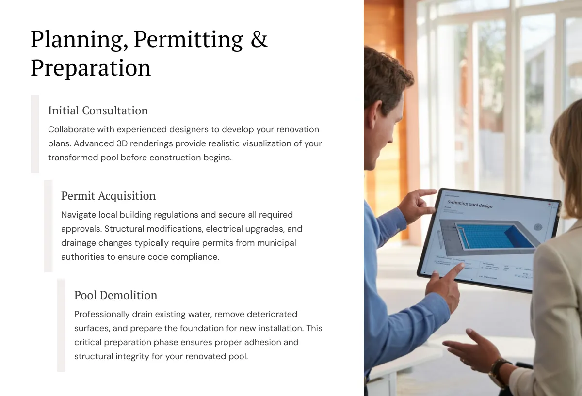 The actual replastering process typically takes 1-3 days depending on your pool's size, shape, and the type of finish you've selected. Smaller residential pools with standard plaster can often be completed in one day, while larger pools or those receiving premium aggregate finishes may require 2-3 days. Weather conditions can also affect timing, as we need optimal temperatures and humidity levels for proper application. We'll provide you with a detailed timeline during your consultation so you can plan accordingly.