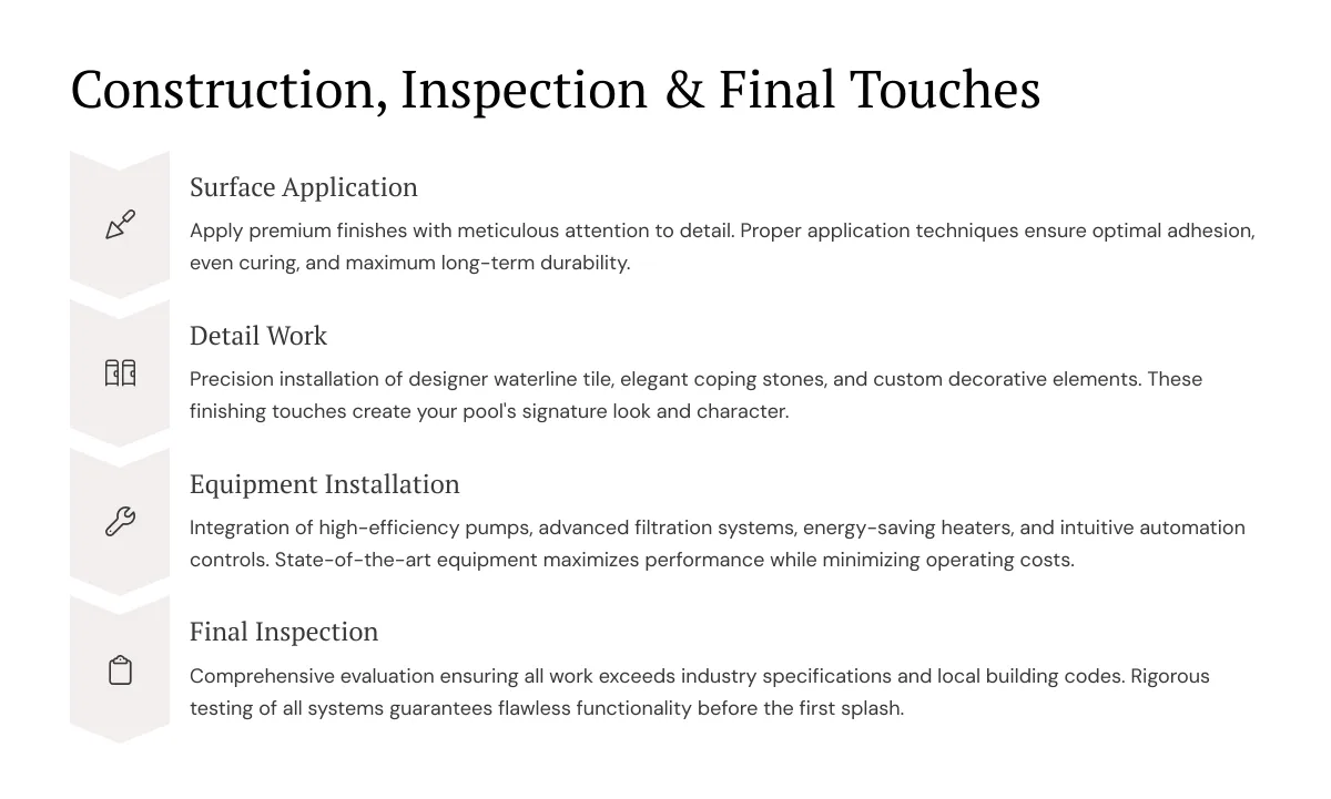 The startup process, also called curing, is a critical period where your new plaster surface properly bonds and hardens. During this time, we carefully fill your pool with water while continuously brushing the surface to remove loose plaster particles and prevent staining. The water chemistry must be precisely balanced and monitored daily, with specific pH and alkalinity levels maintained to ensure the plaster cures correctly. This process requires specialized knowledge and experience to avoid permanent damage to your new surface.