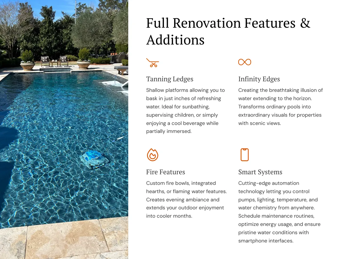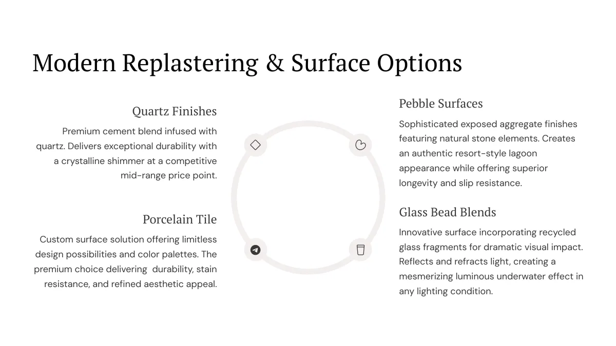 Over time, pool surfaces deteriorate, becoming rough, stained, and potentially unsafe for swimming. Our tailored replastering services breathe new life into your pool using premium materials and proven techniques that ensure lasting durability. Choose from classic white plaster for timeless elegance or upgrade to aggregate finishes that add texture, color, and enhanced longevity.